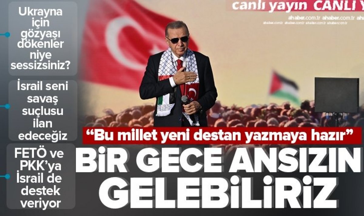 Cumhurbaşkanı Recep Tayyip Erdoğan, "Büyük Filistin Mitingi"nde yaptığı konuşmada, "İsrail sen bir işgalcisin, sen bir örgütsün" dedi ve İsrail'in savaş suçlusu ilan edileceğini açıkladı.