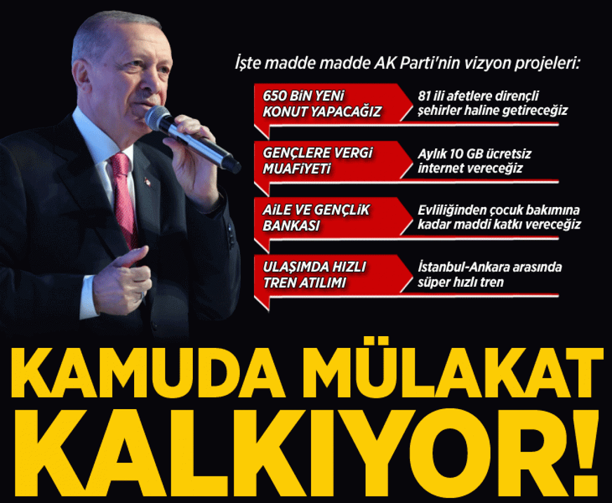 Ev hanımlarına emeklilikten maaş ücretlerine, gençlere vergi muafiyetinden evlenecek çiftlere faizsiz krediden birçok maddenin yer aldığı AK Parti Seçim Beyannamesi'ni Cumhurbaşkanı Recep Tayyip Erdoğan resmen açıkladı.