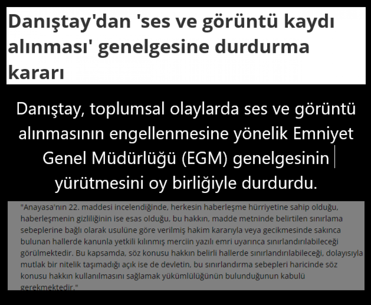Danıştay 10. Dairesi, polisin olduğu olaylarda halkın cep telefonuyla video çekmesinin engellenmesine dair emniyet genelgesinin yürütmesini oybirliğiyle durdurdu. Yer alan kararda, söz konusu genelgenin haberleşme hürriyeti ile basın hürriyetini kısıtlayıcı nitelikte olduğu belirtildi. Temel hak ve hürriyetlerin yalnızca kanunla sınırlandırılabileceği vurgulandı.