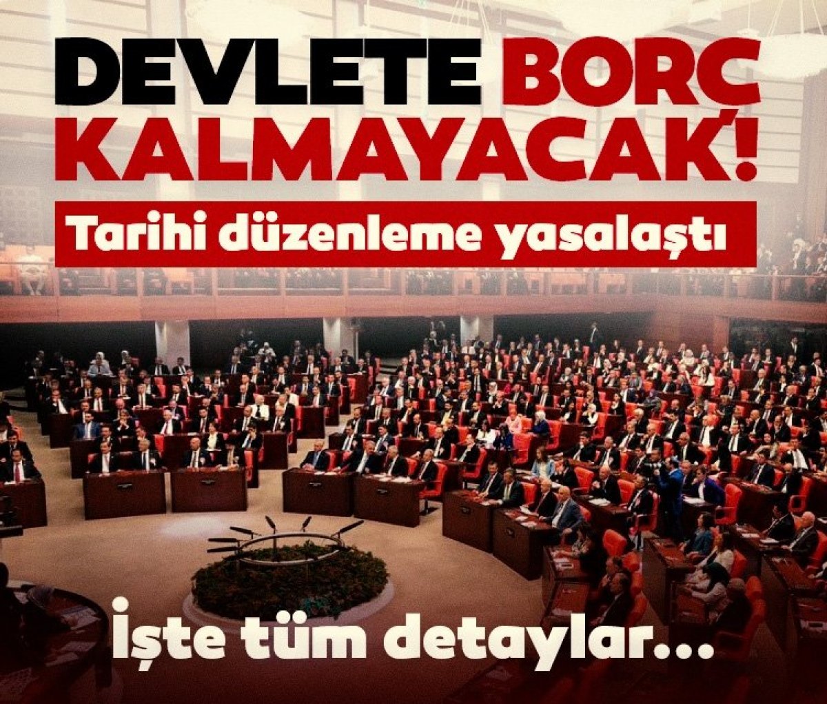 Başkan Recep Tayyip Erdoğan tarafından müjdelenen "borç yapılandırma paketi" ile ilgili kanun teklifi meclisten geçerek yasalaştı. Cumhuriyet tarihinin en kapsamlı borç yapılandırmasını içeren kanun teklifi ile vergi, prim, trafik cezası, köprü geçiş parası, KYK ve GSS borçları, idari ve adli para cezaları, belediyelere olan emlak vergisi, su, çevre temizlik vergisi gibi borçların cezaları kaldırılacak.