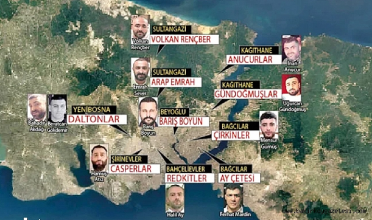 Haritaya göre Sultangazi’de Arap Emrah ve Volkan Rençber, Bağcılar’da Çirkinler ve Ay, Yenibosna’da Daltonlar, Şirinevler’de Casperlar, Bahçelievler’de Redkitler, Beyoğlu’nda Barış Boyun, Kağıthane’de ise Gündoğmuş ve Anucurlar çeteleri faaliyet gösteriyor.