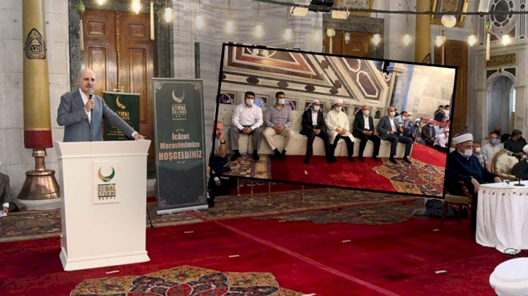 AKP Genel Başkanvekili Numan Kurtulmuş'un da katıldığı törende cami içerisinde konuşma kürsüsü kuruldu, protokol koltukları yerleştirildi.