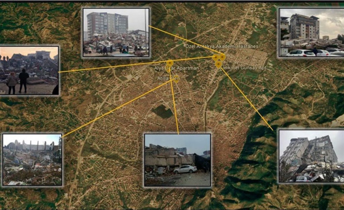 4- O harita deprem gecesi tamamen değişti. Sosyal medya tarandığı zaman Antakya'da en fazla yardım çağrısı gelen yerlerin ilk sırasında bu binaların olduğu görülüyor. Tekrar vurgulayalım; binalar yeni ve sözde deprem yönetmeliğine harfiyen uygun! O harita artık bu halde: