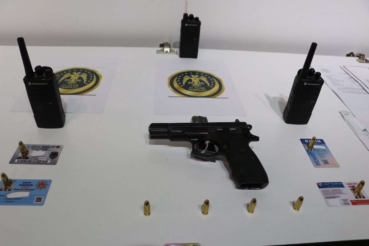 Operasyonda ele geçirilen deliller sergilendi. Silah, polis telsizi, sahte basın ve polis kartları ile çok sayıda öz geçmiş, Mali Suçlarla Mücadele Şubesi’nde görüntülendi